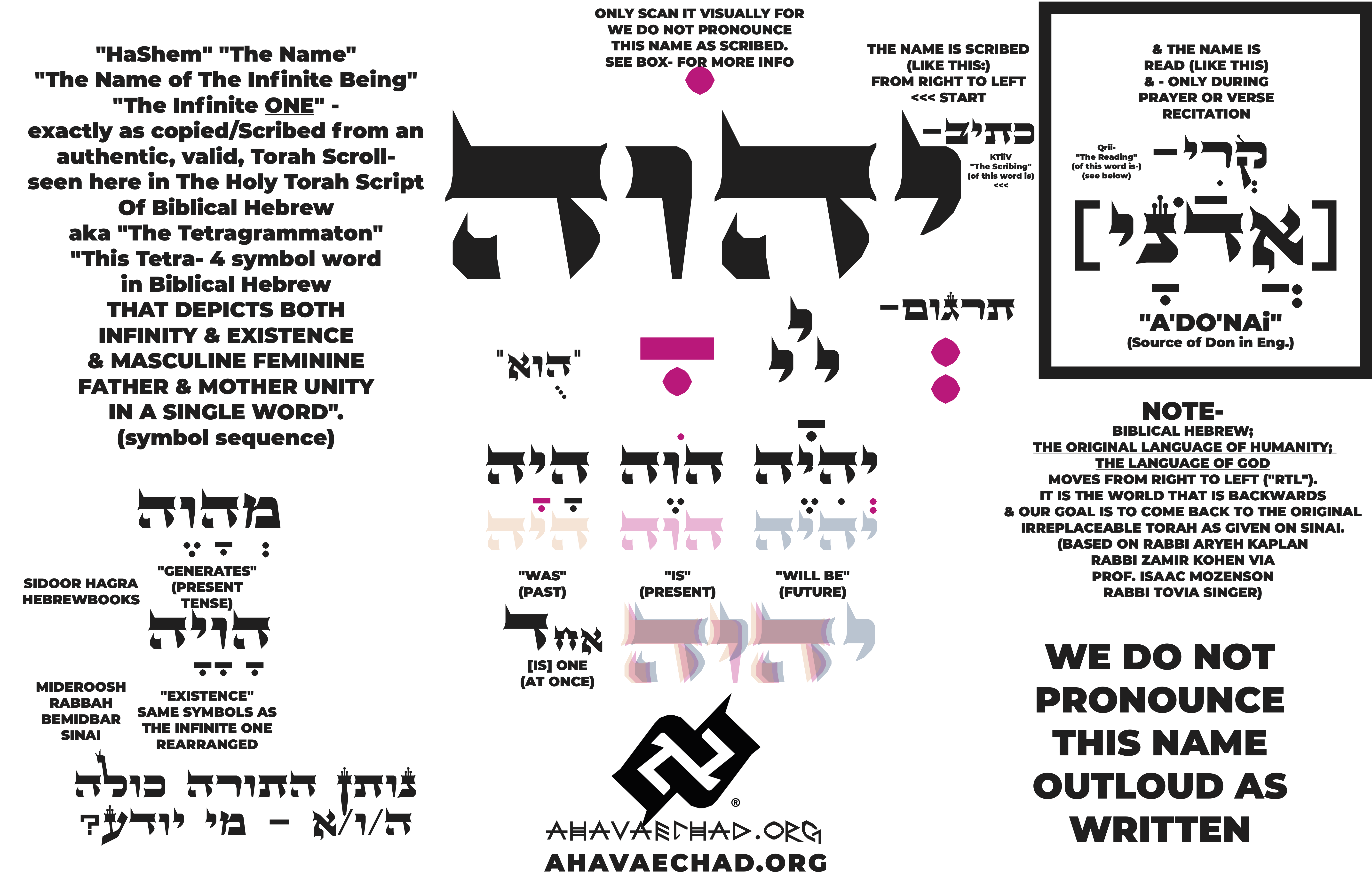 WHO GENERATES EXISTENCE RIGHT NOW – IN THE PRESENT TENSE.NOW WE ARE AWARE THAT THE UNIVERSE HAD A BEGINNING & THAT WHICH IS BEYOND THE UNIVERSE IS INFINITE. WHO IS THE INFINITE ONE? DID WE EVER MAKE DIRECT CONTACT?AHAVA=ECHAD PRESENTS AN ORIGINAL DEMONSTRATION.THE SYMBOLS & CONCEPTS THAT MAKE OUR PHYSICAL WORLD - THE STRUCTURES & CONCEPTUAL IDEAS - ARE THE VERY SYMBOLS THAT ARE PAINSTAKINGLY PERFECTLY COPIEDSYMBOL BY SYMBOL FROM A VALID TORAH SCROLL THAT IS ENTIRELY LOST IN TRANSLATION INTO EVERY OTHER LANGUAGE & SCRIPT - WHICH BEGAN WITH THE FORCED GREEK TRANSLATION OF THE 72 SAGES WITHOUT WHICH NO ONE CAN READ THE SCROLL....THE CLAIM IS THAT THIS IS THE CONNECTION FROM THE SCROLL OF TORAH TO THE INFINITE ONE OUTSIDE THE UNIVERSE