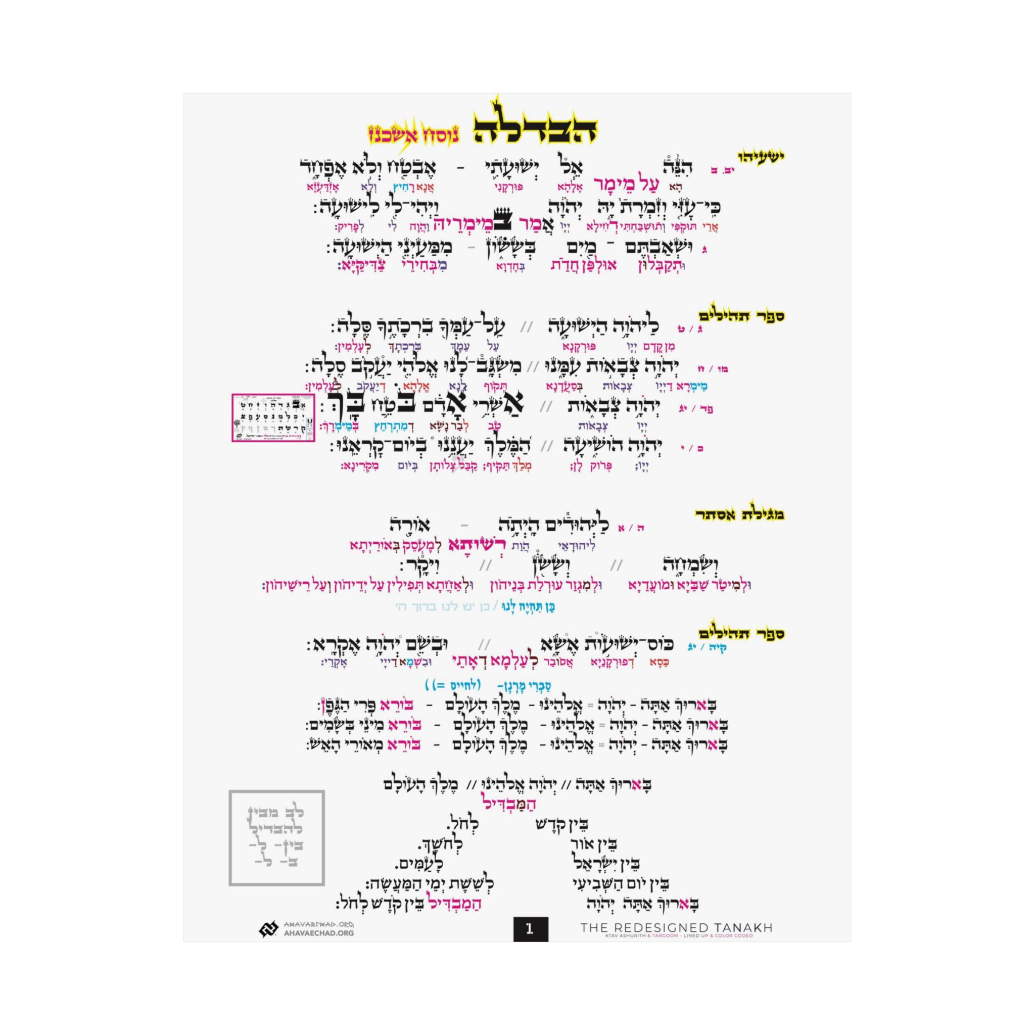 Havdalah Nusach Ashkenaz - Ashurith & Targum Satin Posters (300gsm)