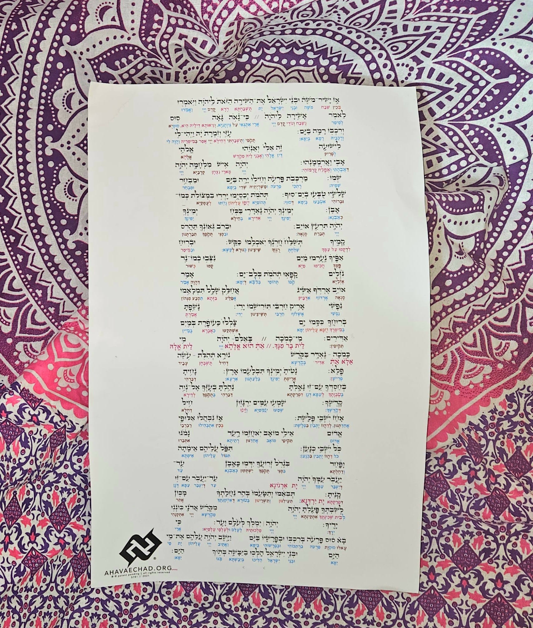 Digital PDF of Ha'azinu (Deuteronomy) in Ktav Ashurith with interconnected Targoom & color coding. Print for Shabbat or study on any device.